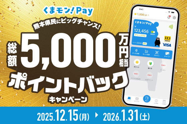 ・抽選期間中に「くまモン!Pay」でタッチ決済(Visa / iD)された1取引を1回として、抽選期間中の全てのタッチ決済取引に対して5回に1回の確率で取引金額相当をポイントバックの対象とします。