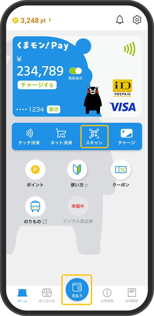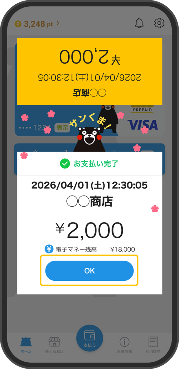 ウォレットに登録した「くまモン!Pay」でタッチ決済する